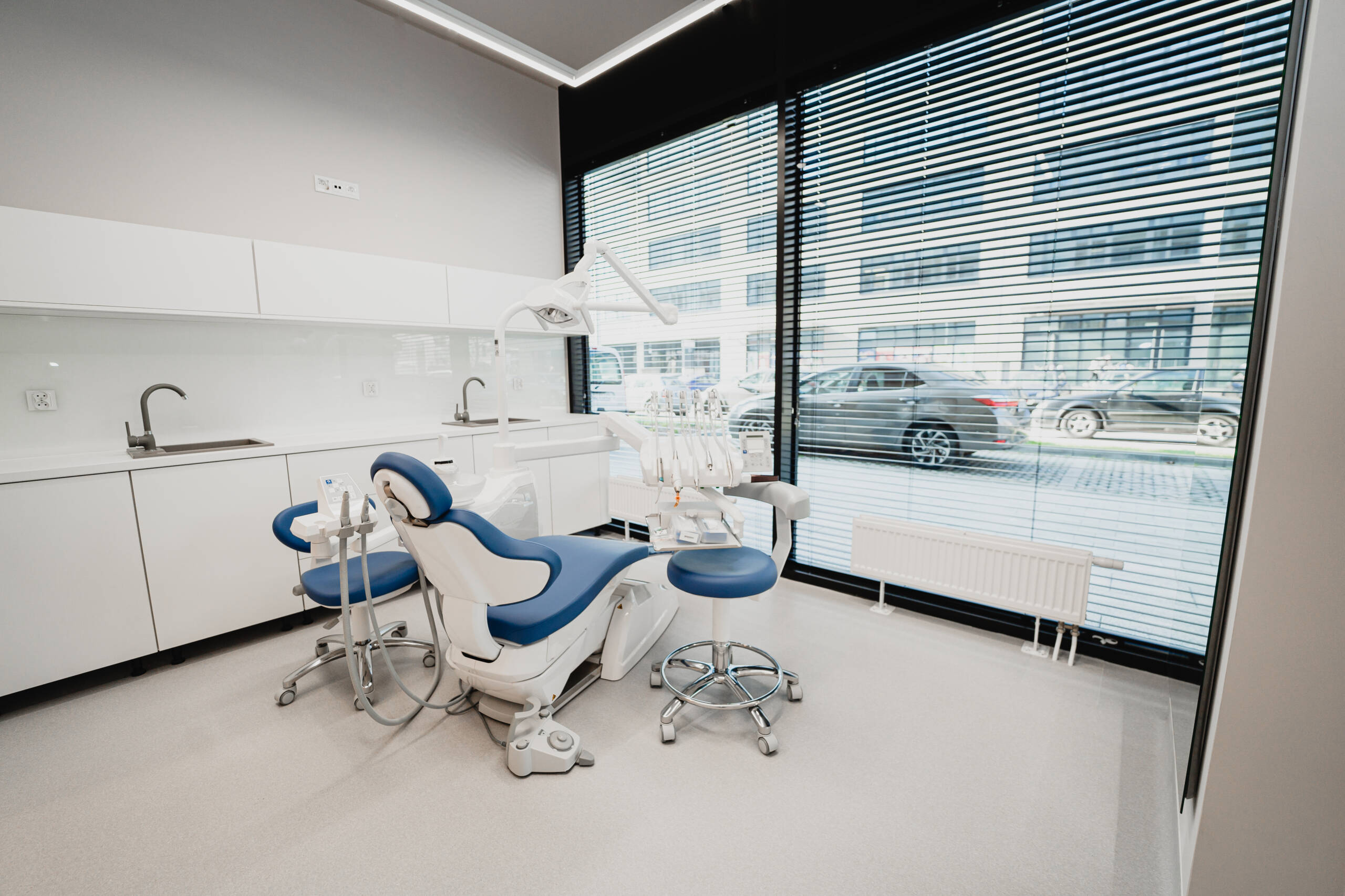 Przedstawiamy projekt nowoczesnej placówki stomatologicznej zlokalizowanej we Wrocławiu, zaprojektowanej z myślą o maksymalnym wykorzystaniu dostępnej przestrzeni i zgodności z obowiązującymi wymogami formalnymi. Inwestycja obejmuje trzy w pełni wyposażone gabinety z unitami stomatologicznymi, rozmieszczone wzdłuż przeszklonej witryny, co zapewnia dużą ilość światła dziennego i buduje otwartą, nowoczesną atmosferę we wnętrzu.