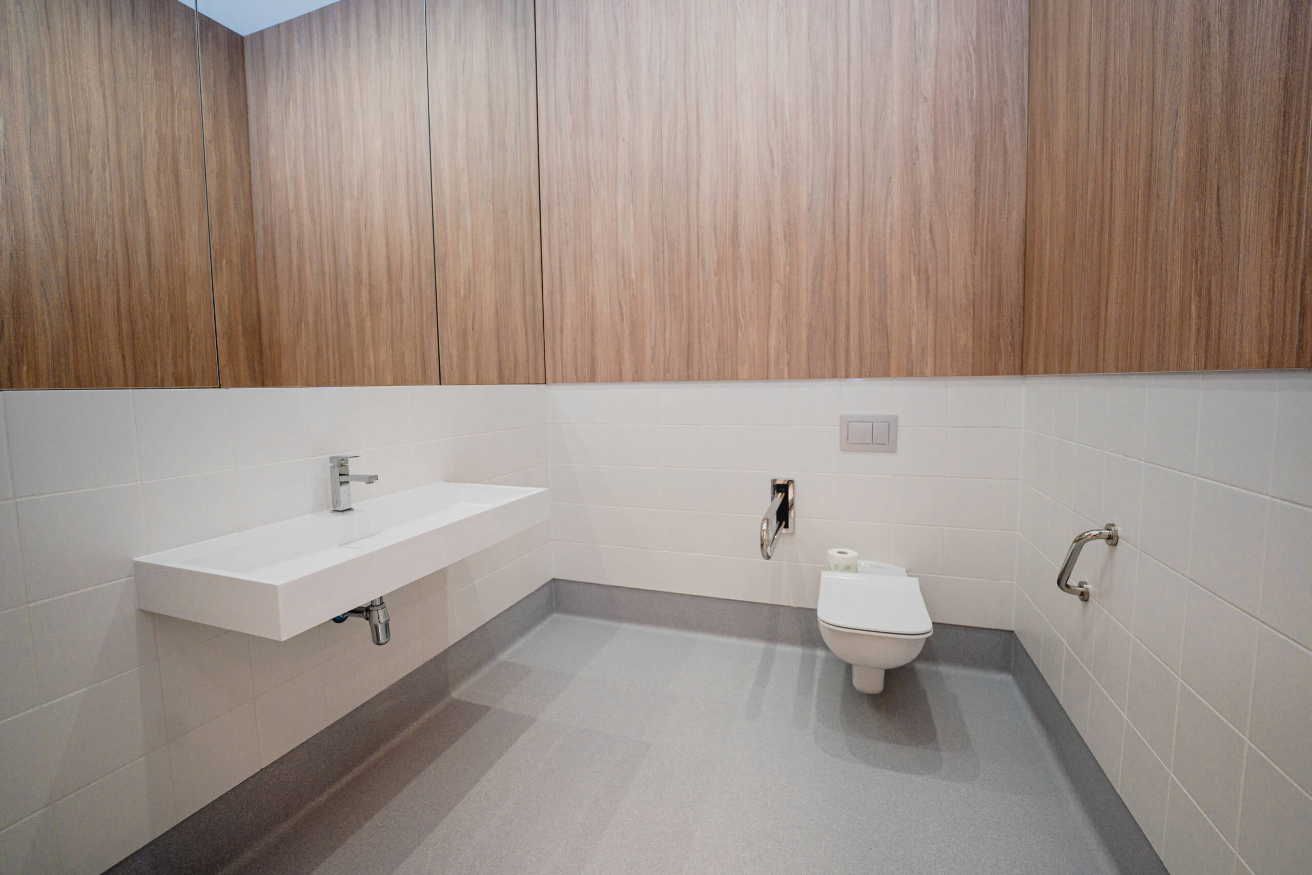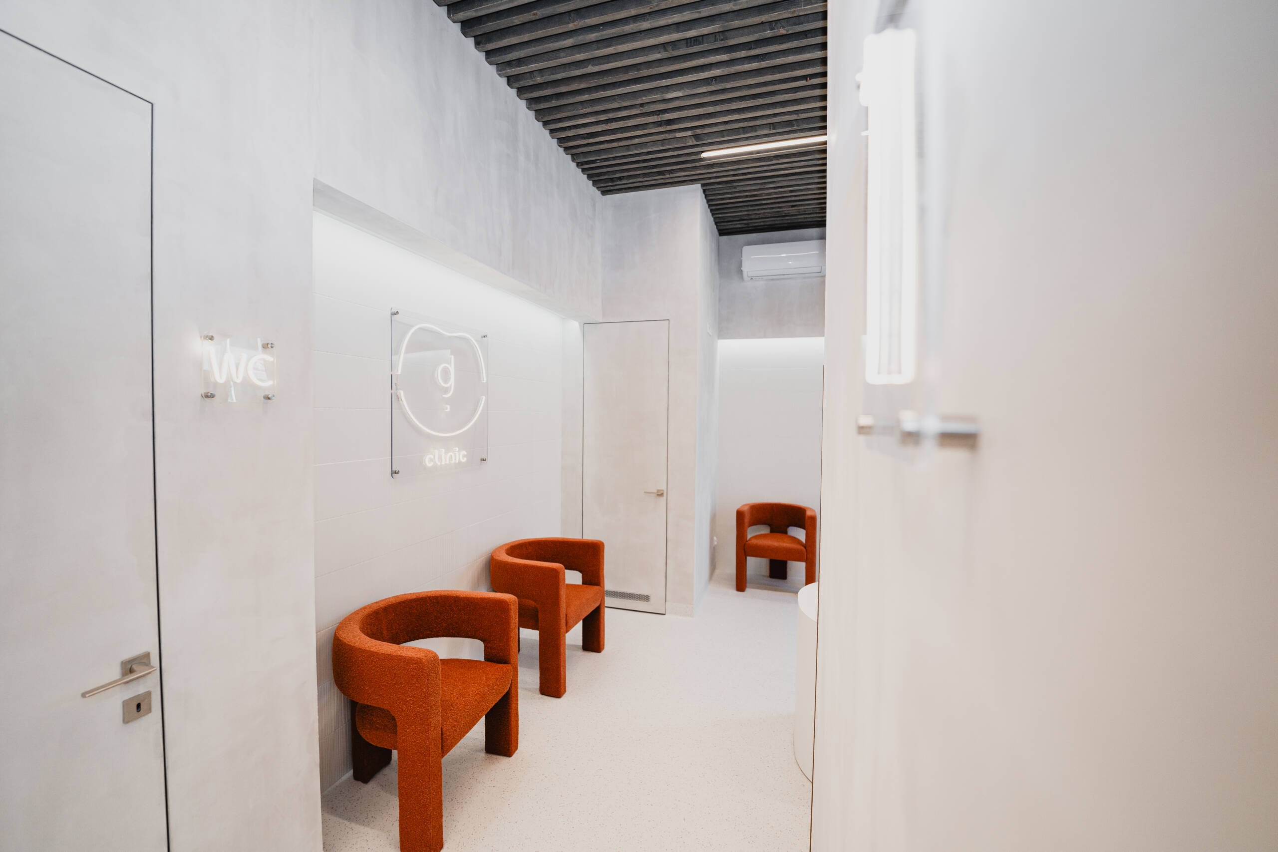 Za przeszkloną strefą frontową, w dalszej części lokalu, zaplanowano komplet niezbędnych pomieszczeń technicznych i zaplecza. Wydzielono sterylizatornię zgodną z wytycznymi Sanepidu, pokój socjalny dla personelu, dwie toalety – osobno dla pacjentów i personelu – oraz pomieszczenia specjalistyczne: techniczne (na kompresory i pompy ssące), na odpady medyczne oraz porządkowe z miejscem na przechowywanie sprzętu do utrzymania czystości.